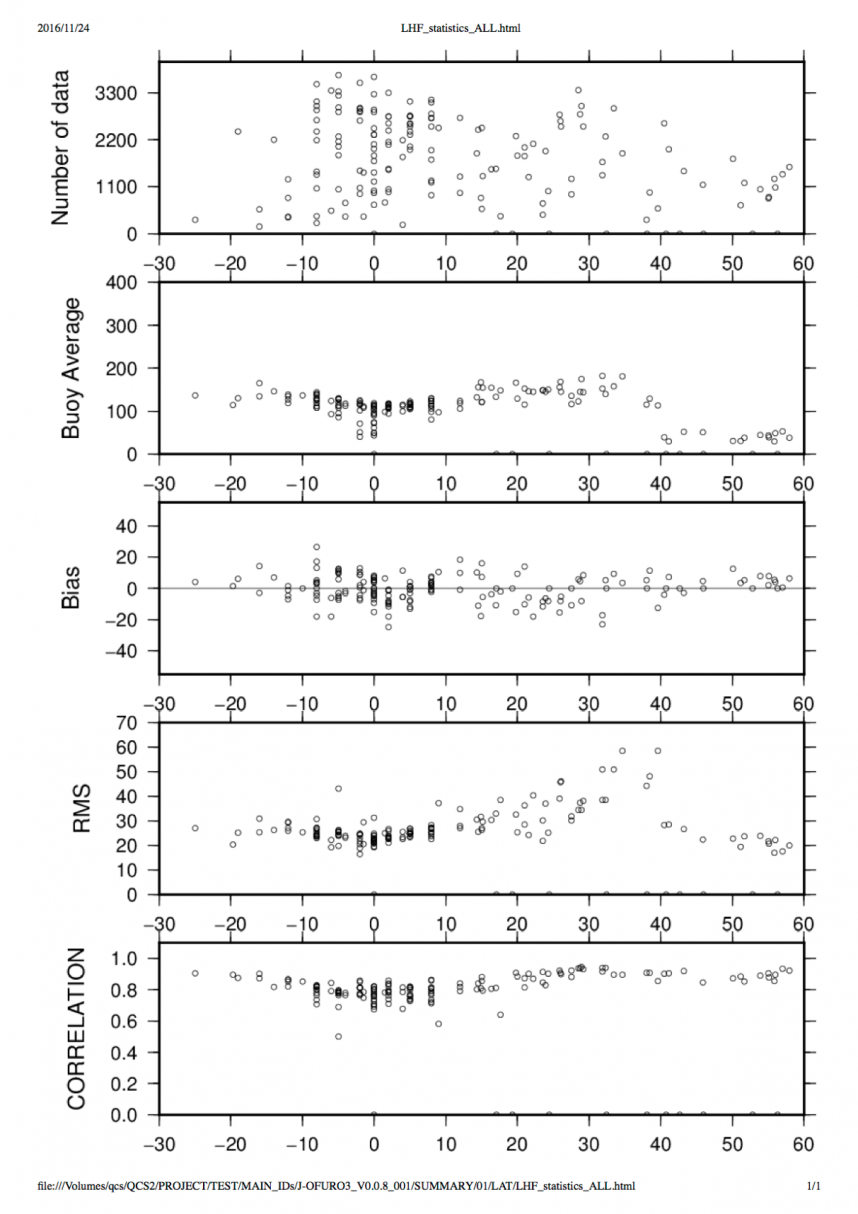 J-OFURO3のデータは、J-OFURO3と同時に開発されたQuality Checking System (QCS) によってその信頼性が常に検証されています。QCSは、全球海洋上の様々な海域の海面係留ブイによる現場観測データをシステムに内包しています。そして、高解像度(10分もしくは1時間毎)の観測データから日平均値を計算し、その値を基準として、J-OFURO3の日平均, 0.25度格子の値と比較を行います。ここでは、主に乱流熱フラックスとそれに関連する物理変数についての検証結果を示します。